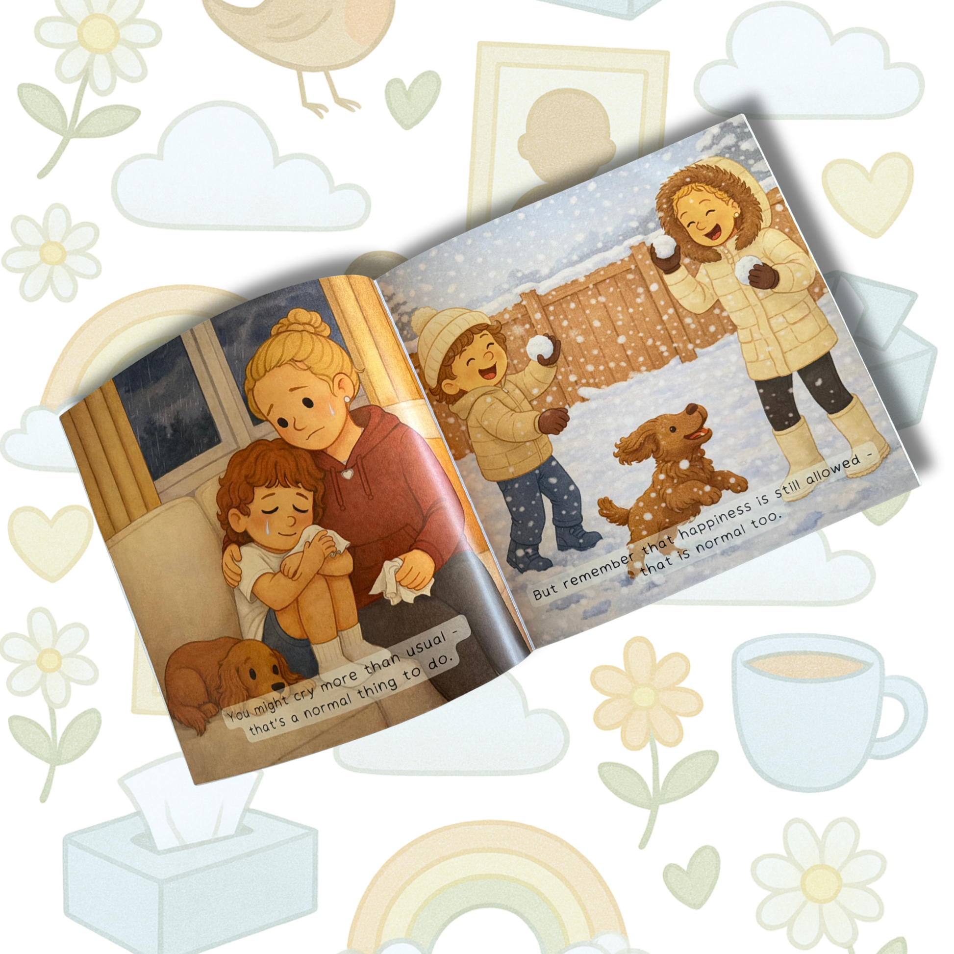 Through simple explanations and validating messages, the book gently reassures children that all feelings are normal — sadness, anger, confusion, and even moments of happiness. It encourages remembering loved ones, finding comfort in everyday moments, and understanding that love never disappears.
